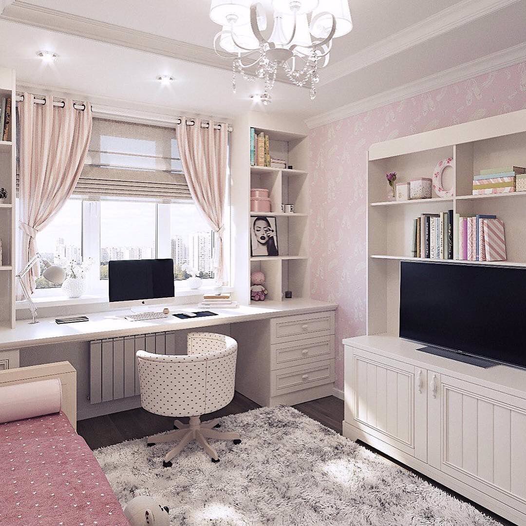Вся розовая и вычурная, эта женственная детская комната обязательно понравится. Независимо от стиля, стеклянный подвесной светильник всегда будет отличным выбором для комнаты девушки.