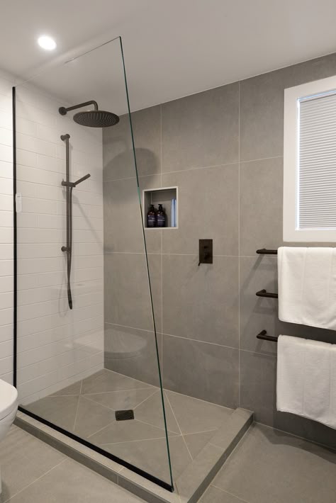 Если вы не любите распашные двери, эта установка со стеклянными панелями по обеим сторонам душа создаст ощущение прохода без двери. И самое приятное то, что пространство по-прежнему кажется открытым и создает идеальную сцену, чтобы продемонстрировать свой великолепный выбор плитки.