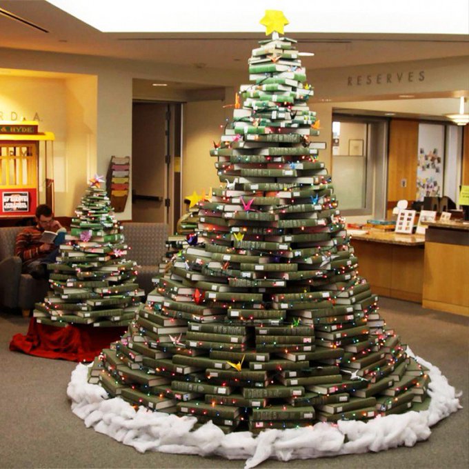 - Новогодняя елка из… всего, чего угодно. Ель можно выложить пирамидкой из любых материалов: стеклянные или пластиковые шары, живые или искусственные цветы, книги, коробки с подарками, и прочее, прочее… А получившуюся пирамидку можно еще и украсить гирляндой.