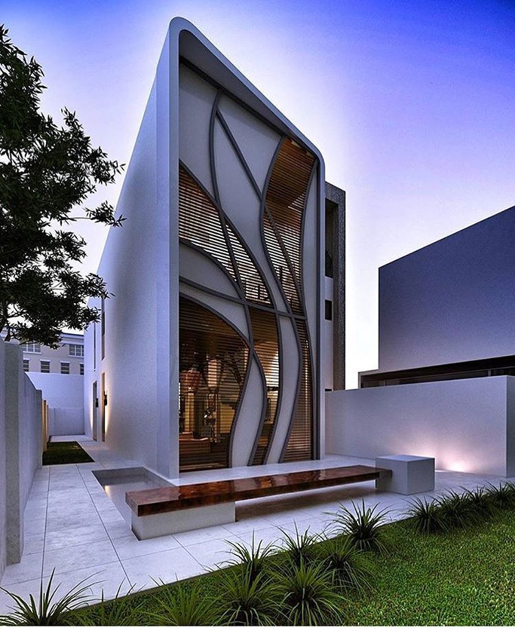 Еще одно очень интересное использование материалов, на этот раз на фасаде с двумя металлическими башнями с зигзагообразным узором в сочетании с полупрозрачным фоном для остальной части здания.