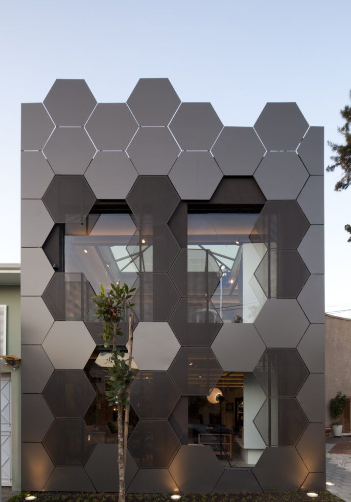 Этот магазин, расположенный в Сан-Паулу, был полностью обновлен студией SuperLimao Studio. Металлический фасад с сотовым рисунком. Некоторые шестиугольники имеют непрозрачное покрытие, а другие полупрозрачные, что создает очень интересный визуальный эффект.