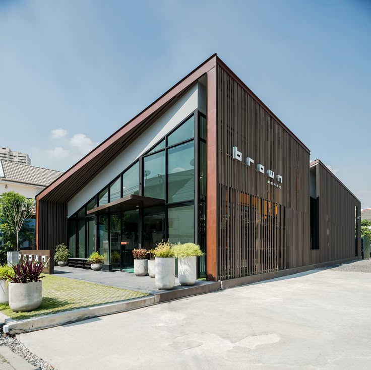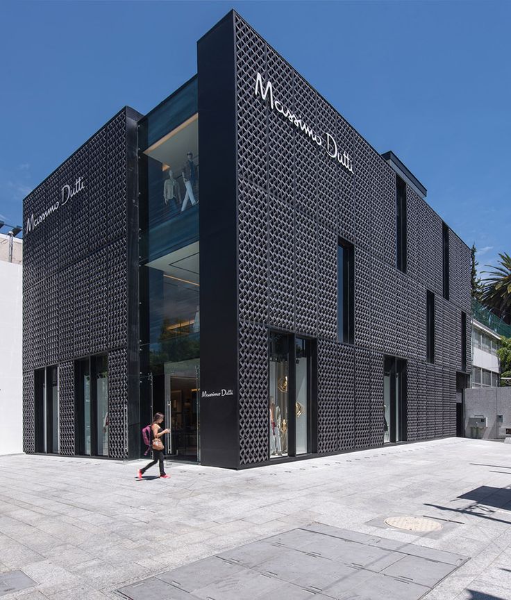 Еще одно очень интересное использование материалов, на этот раз на фасаде с двумя металлическими башнями с зигзагообразным узором в сочетании с полупрозрачным фоном для остальной части здания.