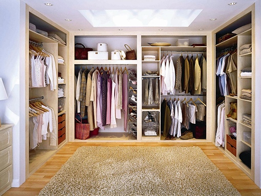 Подобная планировка считается наиболее удачной. Такая гардеробная комната, как правило, имеет прямоугольную форму и обустраивается мебельными системами в форме буквы п. Конструкции занимающие три стены могут отличаться одинаковой или разной длиной.