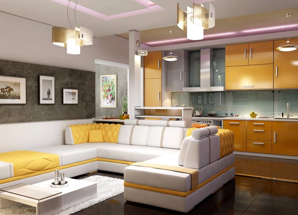Совмещенная кухня с гостиной должна быть хорошо освещенной.