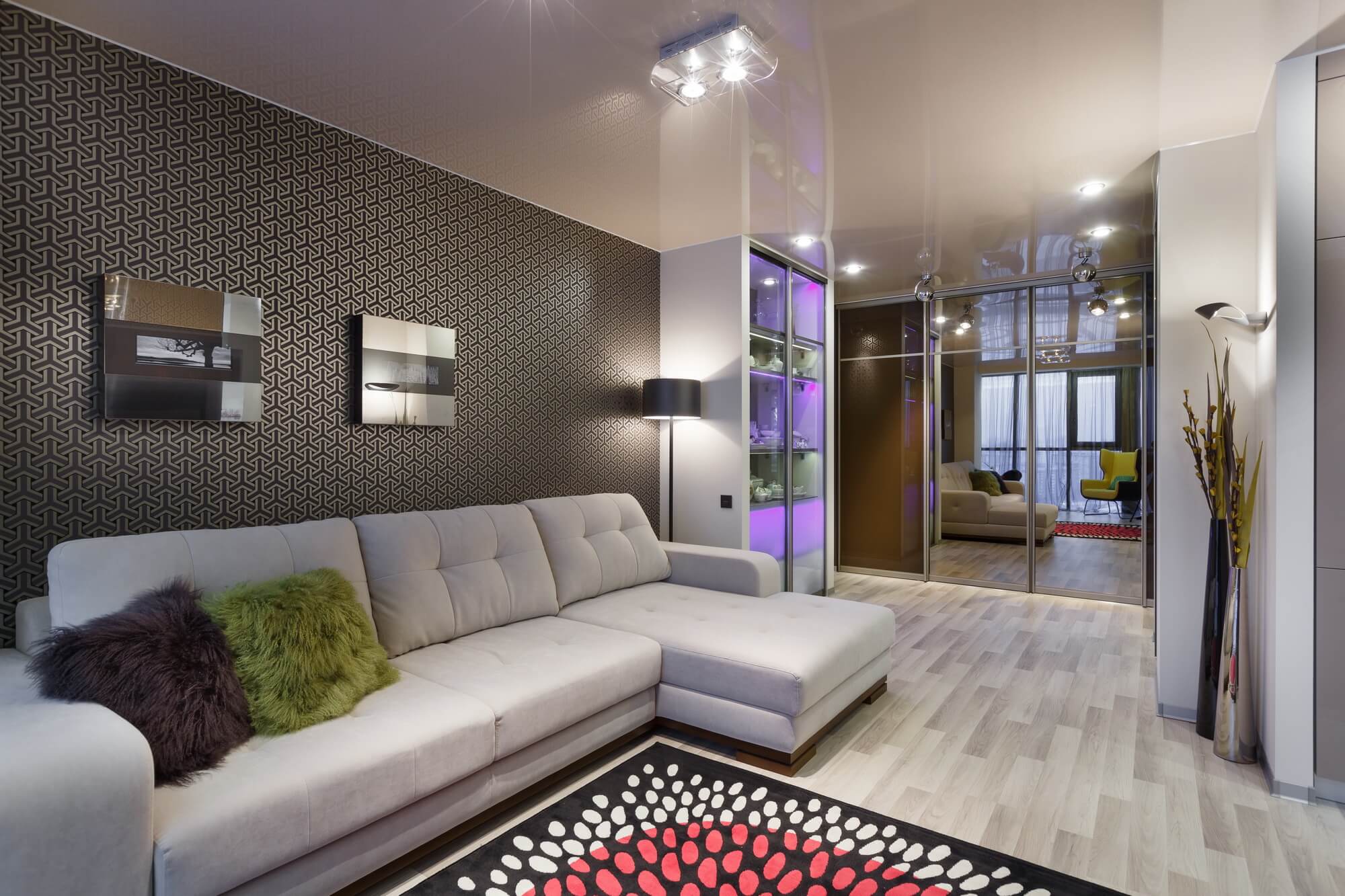 - Глянцевые поверхности лучше отражают свет и способны увеличить пространство.