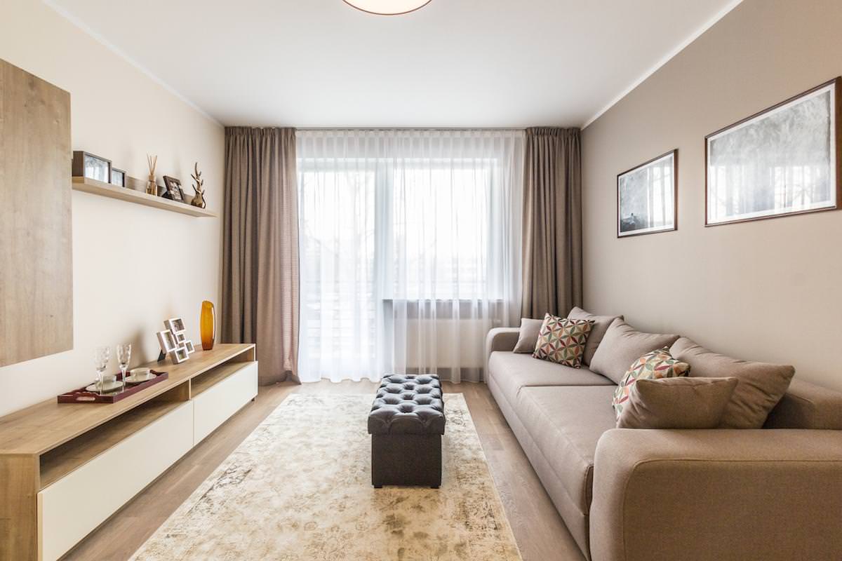 Гостиная должна быть максимально просторной. В этом помогают светлые оттенки, минималистический стиль. Это идеальное решение для оформления небольшой комнаты.