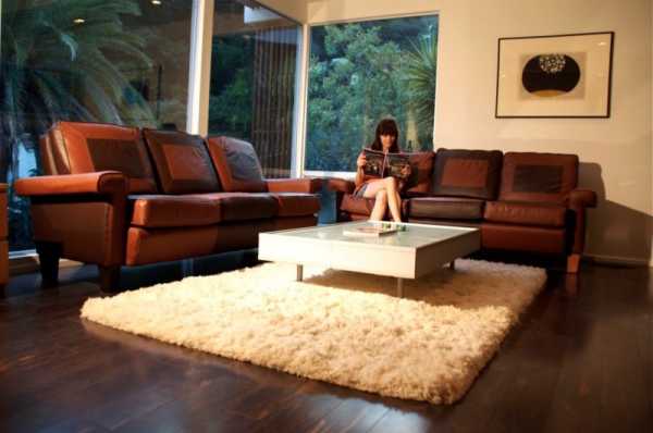 - Ковер. Напольный ковер светлых оттенков наиболее удачно впишется в комнату с коричневой мягкой мебелью. Если вас не пугает обилие коричневых тонов, смело выбирайте ковер кофейного или шоколадного оттенка.