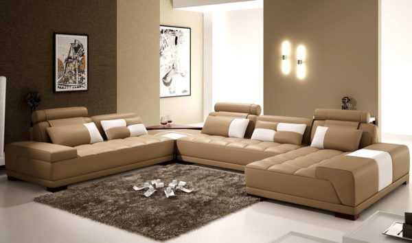 Оттенки коричневого гармонично сочетаются с широкой палитрой цветов. Тенденция, не выходящая из моды — бежево-коричневый. Разбавить интерьер помогут акценты ярких цветов, например желтые, салатовые или с бирюзой. Обивка дивана может быть двухцветной, полосатой или сочетать много цветов одновременно.