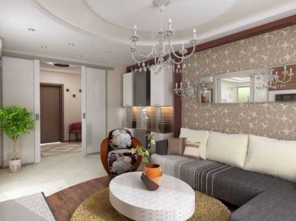 Очень часто при устройстве интерьера гостиной в проходной комнате сносится перегородка между прихожей и комнатой. Такая комната будет смотреться больше, необычнее. Зонировать прихожую можно отдельной группой светильников, невысокой мебелью или небольшим подиумом.