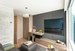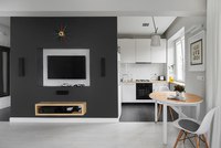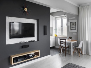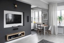 - Телевизор, с помощью которого разделили спальню и гостиную, теперь можно поворачивать в любую сторону, раздвижной обеденный стол небольших размеров – в случае необходимости легко разложить.