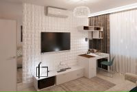 Второй проект дизайна 1-комнатной квартиры подойдет паре с ребенком, а также человеку, работающему дома. Мебель расставлена таким образом, что в одной комнате нашлось место и для игр, и для работы, хранения и сна.