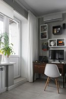 Зона гостиной с раскладным устройством легко преобразовать в спальню. Внимание рабочему месту в интерьереено достаточно. Это не просто рабочий стол, а целая система шкафов и полок.