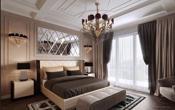 В оформлении спальни использованы спокойные цвета: белый и бордовый, серый и черный, бежевый и шоколадный. Часто можно увидеть использование трех цветов, один из которых является элементом роскоши, а два других служат фоном. Последний и важный штрих в спальне — хрустальная или необычная стеклянная люстра.