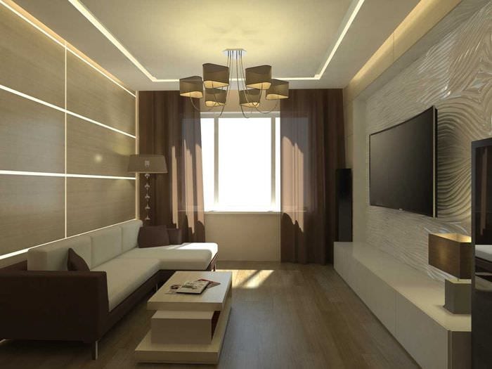 Важной составляющей в гостиной 20 кв.м является потолок. Он является основным элементом в зонировании площади. Достаточный объём помещения позволяет украсить потолок лепниной. Распределить её предлагают по центру, а можно по боковой части. Стены могут быть также украшены: обои и декоративные элементы. Вся задумка будет пользоваться успехом в том случае, если не переусердствовать с декором. Слишком много лепнины с нарядными стенами создадут хаотичное настроение и явный перебор. Если высота потолка достигает 3 м, хорошо бы спланировать многуровневый потолок. Переход цвета и освещения плавно разбавит зоны. Не стоит забывать о том, что тёмная середина потолка и светлые края визуально вытягивают пространство вверх. Если внимание акцентируется на стенах, то лучшим решением будет использование одноуровнего потолка. Можно соорудить натяжной матовый потолок, встроить светодиодные лампы. Для напольного покрытия лучше подойдёт паркет, ламинат натуральных оттенков.