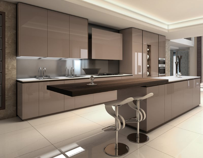 Самым распространенным вариантом можно назвать светлую кухню белого, бежевого или серого цвета, дополненную противопоставленными общей палитре темными элементами: черными, темно-коричневыми. В целом современный стиль позволяет сочетать цвета в соответствии с собственным пониманием идеального дизайна, практически не ограничивая себя в их разнообразии.