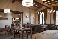 - Внутренне пространство дома из бруса ни в коем случае не должно напоминать интерьер гостиницы – безупречный с точки зрения стиля, но абсолютно обезличенный. Поэтому, холодному минимализму сразу говорим твердое «нет». А акцент делаем на сложных и дорогих по своей фактуре материалах, внятных и простых формах мебели из природных материалов, симметрии, плавных линиях и понятной геометрии всех архитектурных элементов.