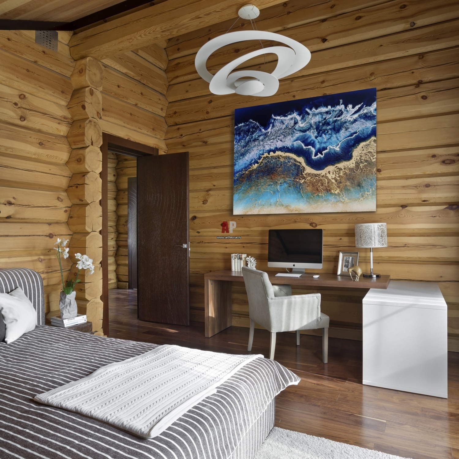 Предлагаем к просмотру пять работ известных дизайнеров, которые в своих проектах спален не маскировали брус, а профессионально его обыгрывали.