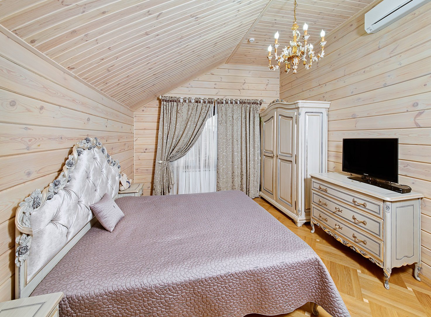 На фото интерьер сложился. Текстура дерева сохранена, но сам брус покрашен светлой краской на натуральной основе. Благодаря такому покрытию дерево со временем не пожелтеет.