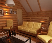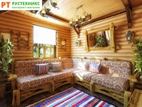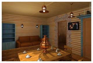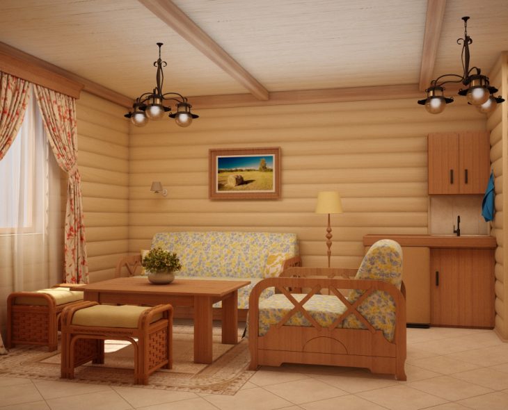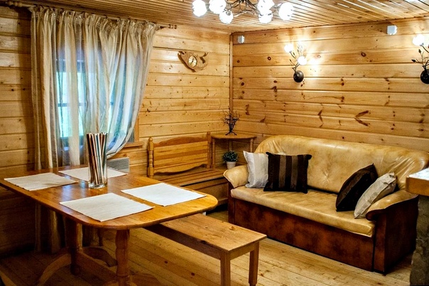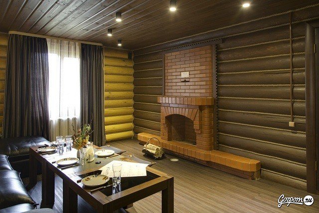 Просто и стильно выглядит комната отдыха, отделанная деревом. Деревянный стол с простой скатертью, длинная лавка могут вместить много гостей для чаепития. Дополняют интерьер легкие занавески для окон. На стене может разместиться картина в простой рамке или любой другой элемент декора. Украшением такого интерьера станет русский самовар.