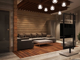 Современный стиль подразумевает простоту и элегантность с добавлением элементов роскоши. Могут быть оборудованы потолки в несколько ярусов, красивые окна с прочными стеклами, кабинки для сауны, бассейн. В любом случае комната отдыха должна быть оборудована изысканной, но деревянной мебелью. Можно сделать акцент на освещении, обустроив интересные светильники. При этом не стоит забывать о технике безопасности.