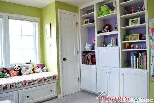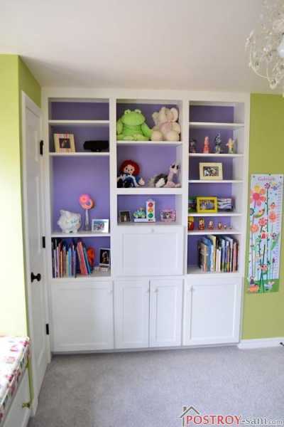 - Высоту полок и шкафов нужно рассчитать так, что ребенок мог без труда достать необходимые для игры или занятий вещи. Обдумывая дизайн детской комнаты для девочки младше трех лет, нужно предусмотреть и места, недоступные, до поры до времени, маленькой проказнице.