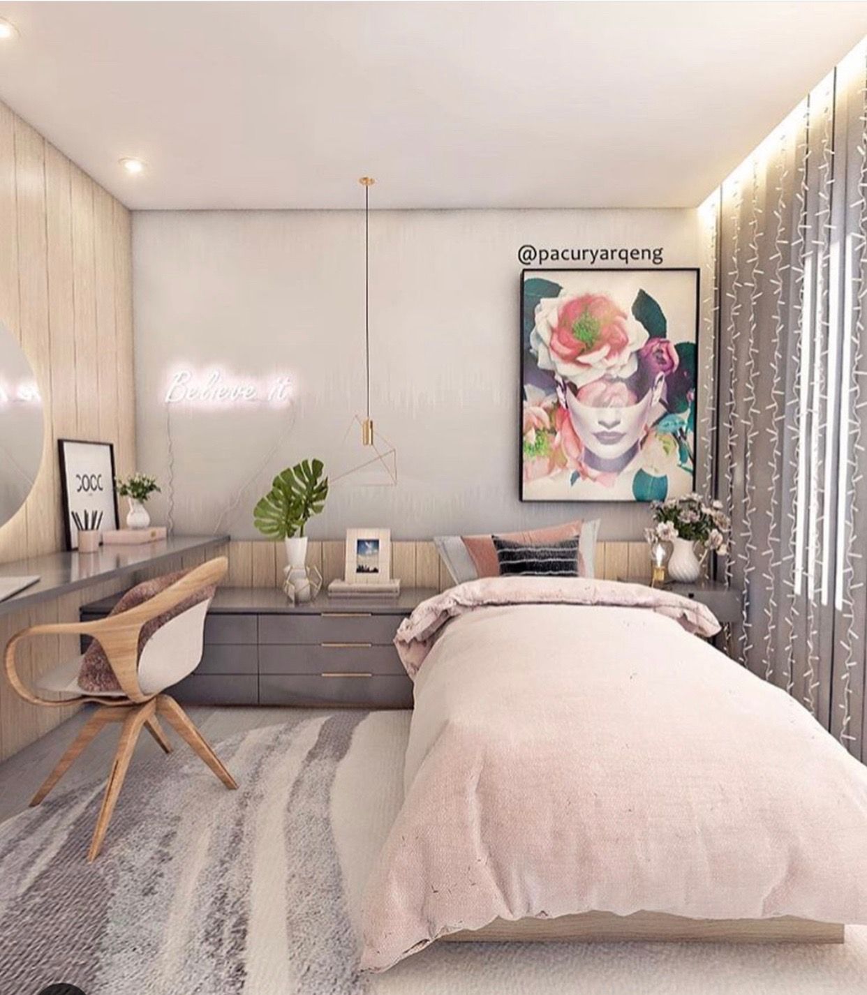 Огромной тенденцией в дизайне интерьеров стало использование геометрических узоров в качестве вдохновения для декоративных элементов.Если вашей девушке-подростку нравится этот современный дизайн, то ей стоит подумать о том, чтобы геометрические узоры украсили ее комнату! Вы можете попробовать найти обои с уникальным геометрическим рисунком, а также подушки и одеяла с таким же рисунком. Возможно, вы все еще ищете удивительное сочетание цветов для комнаты своего подростка, мы бы порекомендовали попробовать розовый и серый!