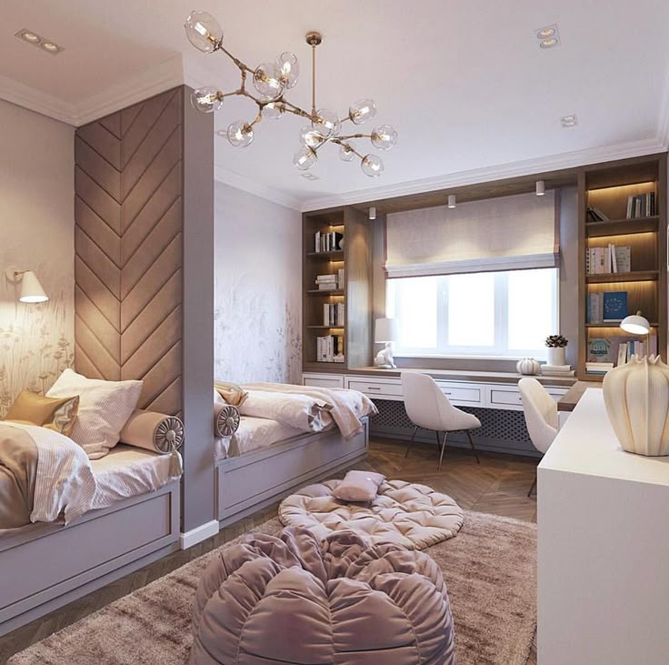 Если вы планируете оформить комнату для девочки, используйте бело-розовые тона, чтобы создать ощущение светлого и просторного интерьера спальни, и используйте дополнительные шторы для каждой кровати, чтобы создать уединение потому что нет места для уединения. Только взрослые, но детям тоже иногда нужна свобода. Такой дизайн комнаты также поможет вам проявить уважение к ребенку.