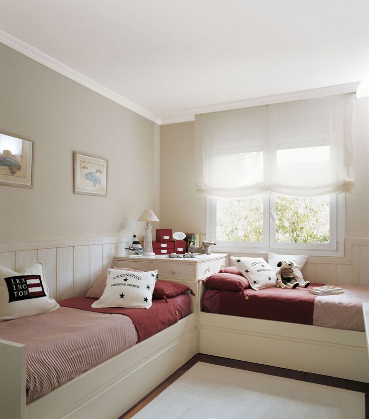 Расстановка двухъярусных кроватей в маленькой комнате довольно сложная, но если уметь, то выглядит очень красиво Как расположить две односпальные кровати в маленькой комнате Поставить две кровати в перпендикулярной части двух стен