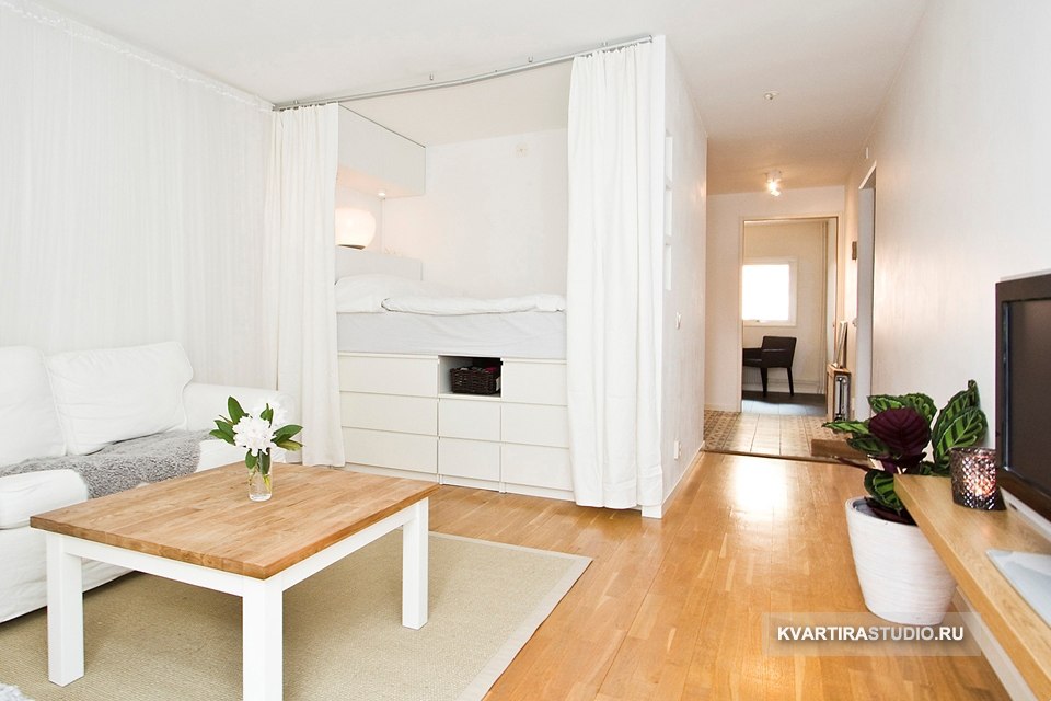 Важным элементом в оформлении интерьера маленькой комнаты станут шторы. Отдавайте предпочтения светлым тонам в вертикальную полоску. В таком случае стены будут казаться выше. Идеи, как красиво обставить однокомнатную квартиру можно почерпнуть из различных стилей оформления: кантри, минимализм, модерн, конструктивизм, хай-тэк, ориентальный стиль. Выигрышным вариантом может стать зонирование комнаты с помощью тканевых материалов, оргстекла с принтом, бамбуковых или рулонных штор. Главное, чтобы это решение сочеталось с общей стилистикой квартиры.