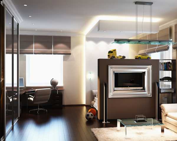 В дизайне детской комнаты для мальчика подростка обязательно использование современных материалов и оригинальных текстур в отделке. Стильное решение — натяжной потолок с точечным освещением, глянцевые поверхности и компактная, но вместительная система хранения. Минимум дизайнерских аксессуаров и максимум вещей, отражающих характер подростка.