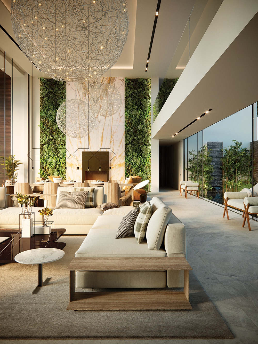 Современная гостиная с белой мебелью, столом и лампой из натурального дерева.