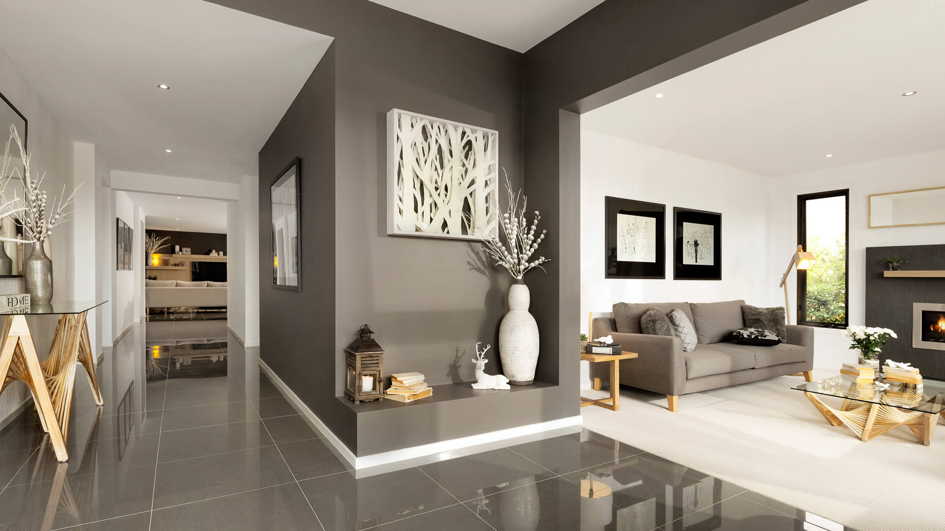 Важный элемент интерьера контемпорари – освещение, зачастую срытое. Подсвеченные ниши, стены и другие зоны участвуют в формировании пространства. Интерьер в подобном стиле тяготеет к массивным формам, поэтому для комнатных растений подбираются большие контейнеры. А маленькие фотографии и графические рисунки в тёмных рамках размещают на стенах в виде целостной композиции.