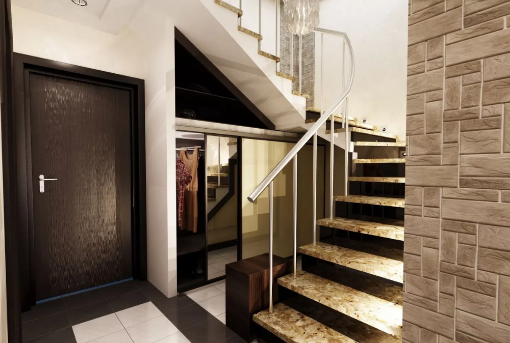 Подлестничное пространство закрывают встроенными шкафами. В небольшом помещении может быть оборудована прихожая под лестницей на второй этаж.