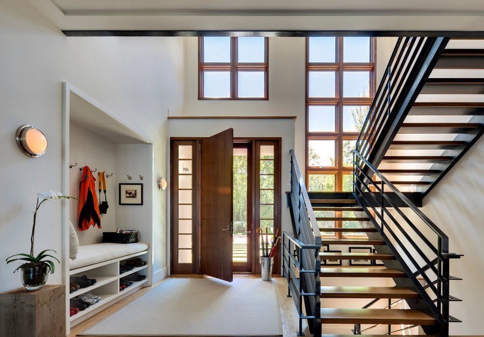 Лестница в прихожей частного дома может быть в разных стилях, расцветках и моделях. Главное, чтобы была безопасной, удобной и гармонировала с интерьером холла.