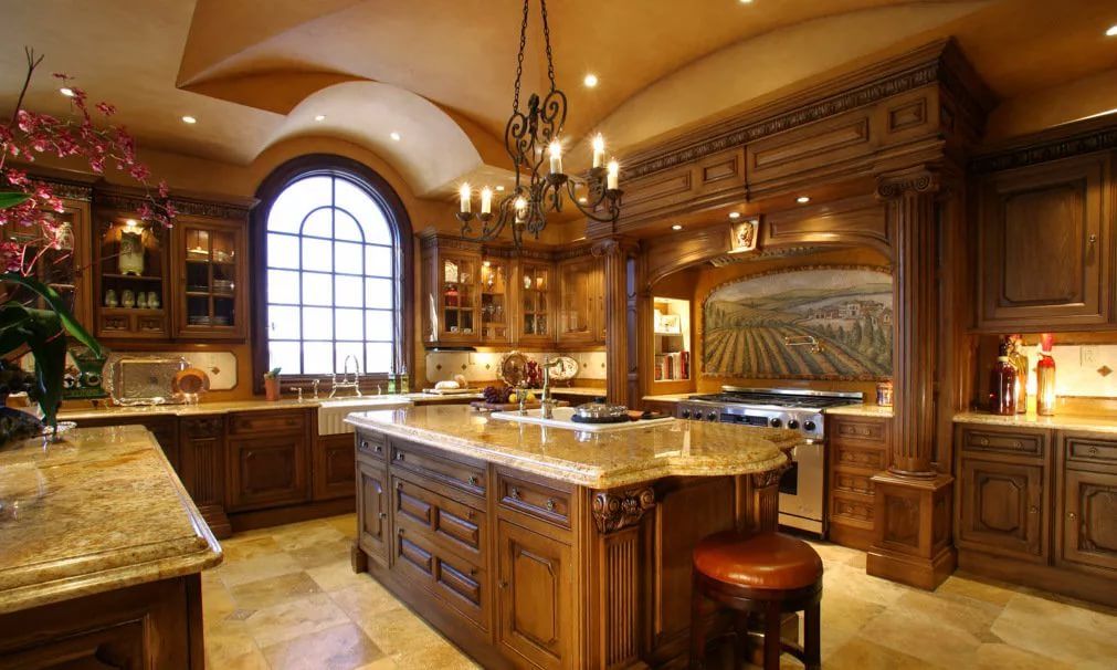 Многие находят уютной старинную классику: в такой кухне чаще всего используется деревянная мебель со изысканной фурнитурой, молдингами и узорчатой вырезкой на поверхностях.