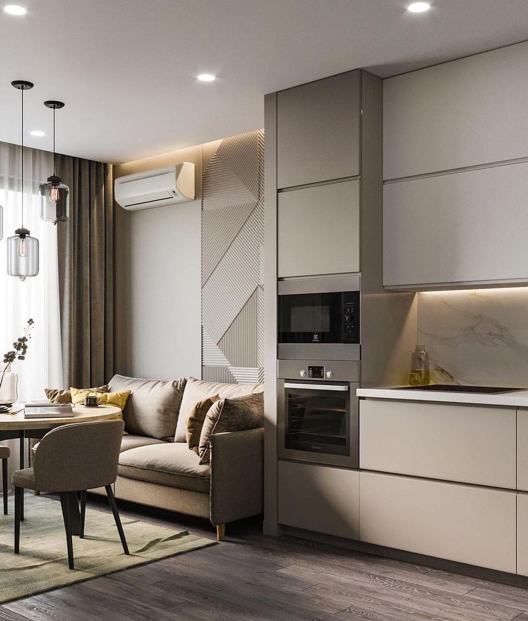 Компактная зона готовки округлого типа экономит место для гостевого пространства, являясь перегородкой или функциональным разделителем.