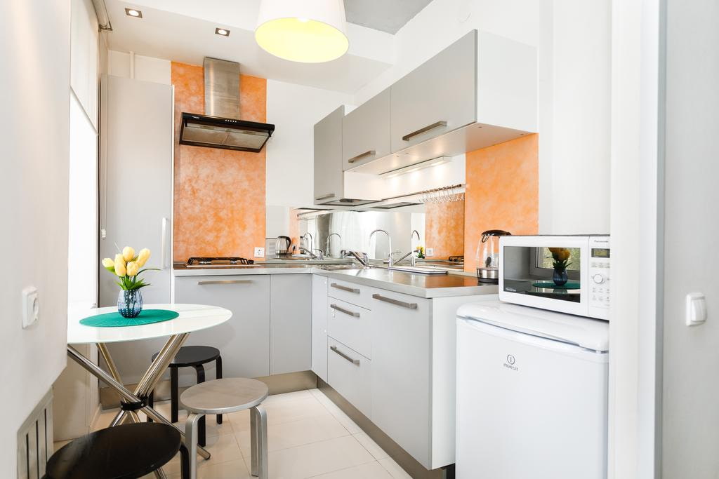 На маленькой кухне в квартире не следует заполнять шкафы сверху вниз..