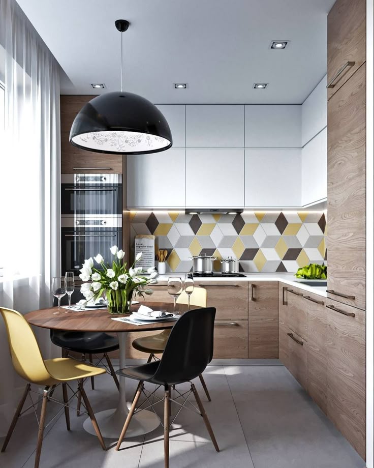 Часто при современном дизайне кухни 9 кв.м выбирают обои с крупным узором, которые не подходят под маленькую по площади кухню. Для кухни 9 кв.м лучше выбрать сдержанный рисунок: цветочки, полоски, геометрические фигуры, но обязательно с глянцевой поверхностью.