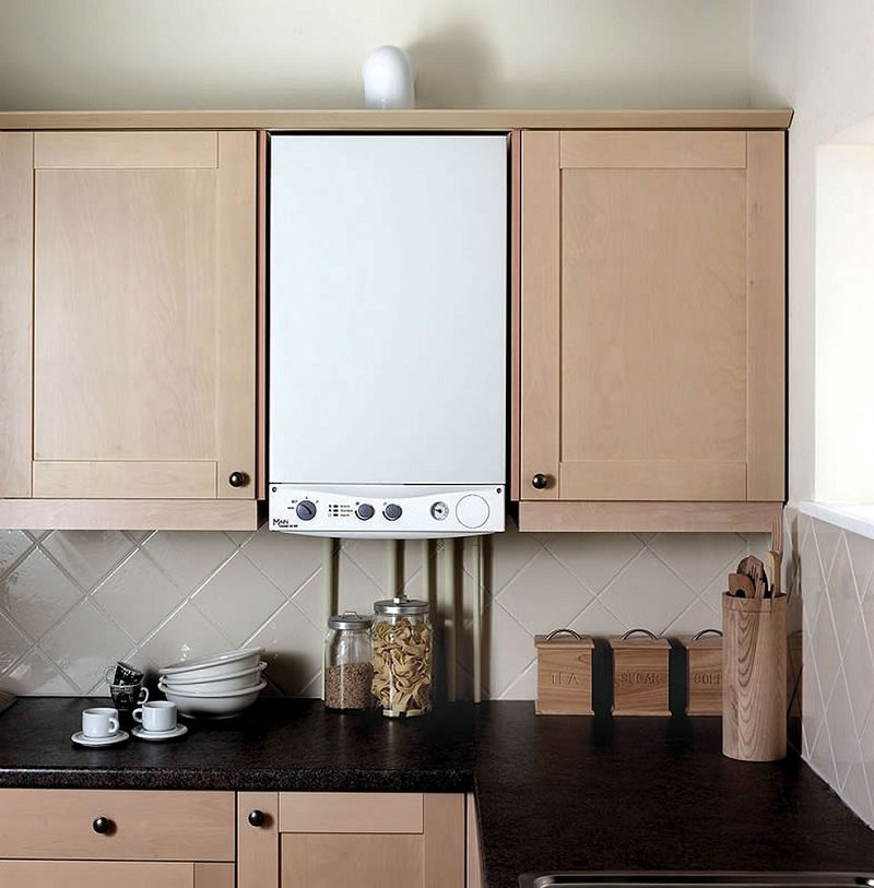 В ряде случаев пожарные нормативы требуют низкого расположения газового водогрея. Выйти из положения можно за счет высокого пенала. Если дизайн аппарата позволяет оставить его открытым, то все подходящие к нему трубы необходимо закрыть коробом в тон гарнитура. Обычно этот элемент заказывается вместе с мебелью.