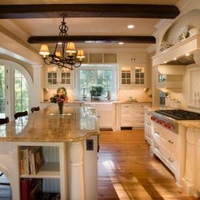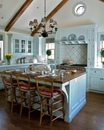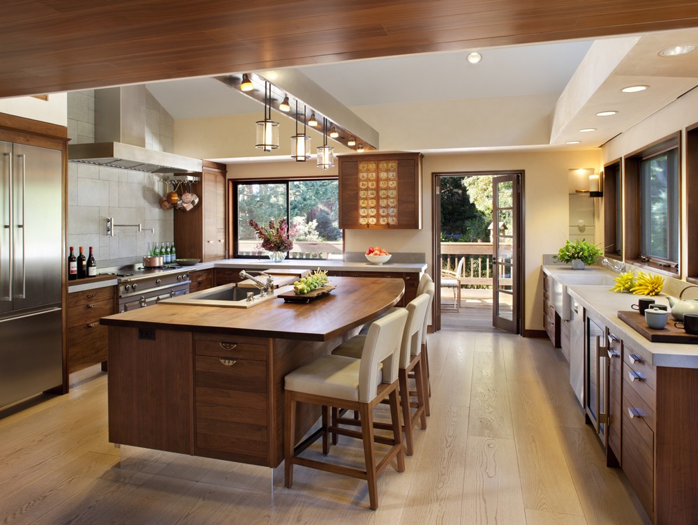 Такое обустройство очень хорошо смотрится в просторной кухне в частном доме. Роль острова обычно играет рабочая зона, в которую входит мойка, разделочный стол со шкафами внизу и варочная поверхность. К потолку над прикрепляется мощная вытяжка и светильники. Также условно островом можно считать массивный обеденный стол, установленный по центру при П- или Г-образной планировке.