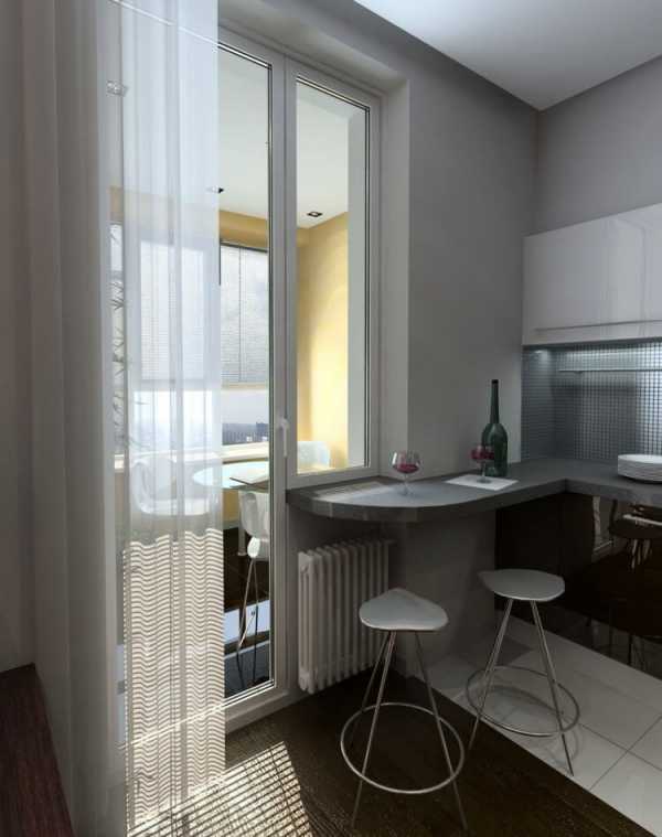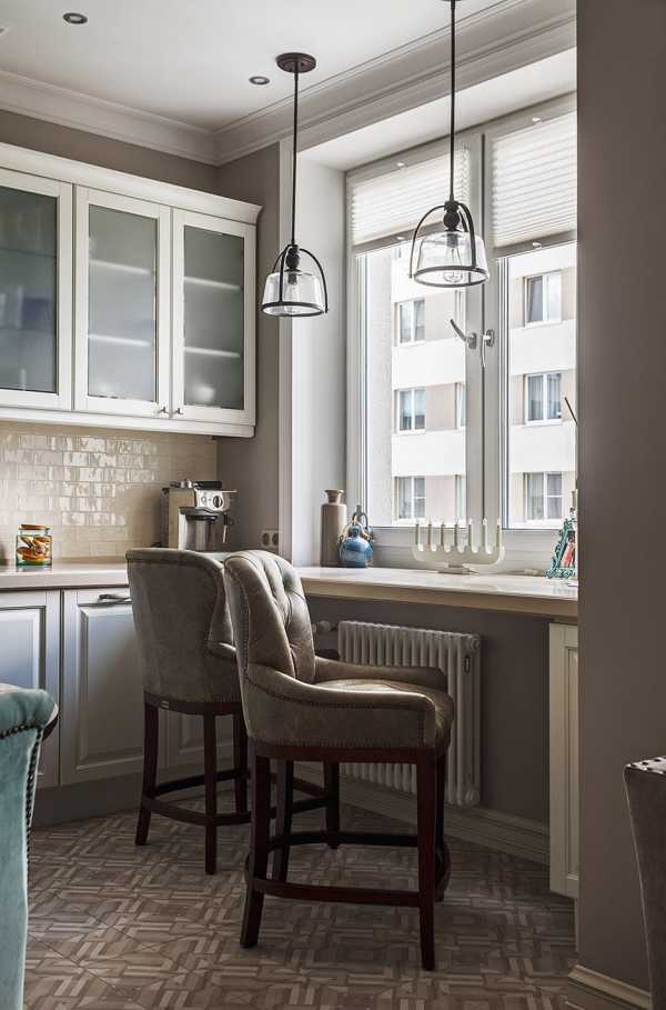 Обеденный стол (барная стойка) вместо подоконника – практичное решение для кухни в 5 кв. метров.