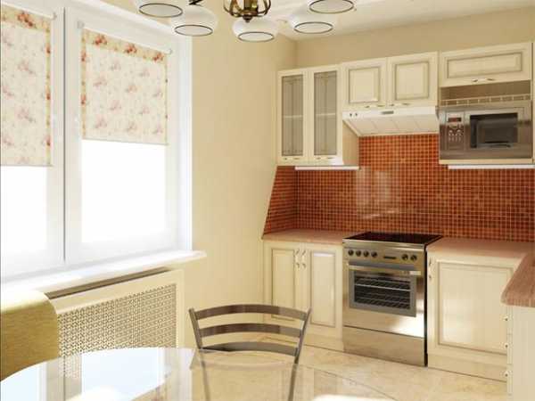 - Избегайте массивных штор и карнизов, «утяжеляющих» кухню 8 кв. м, дизайн которой лучше дополнить компактными светлыми роллетами.