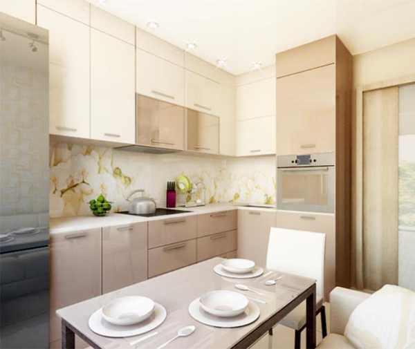 - Хорошо, если гарнитур будет с глянцевым светоотражающим покрытием. У 8 м2 кухни дизайн должен быть максимально простым и однотонным, чтобы придать помещению простора и свежести.