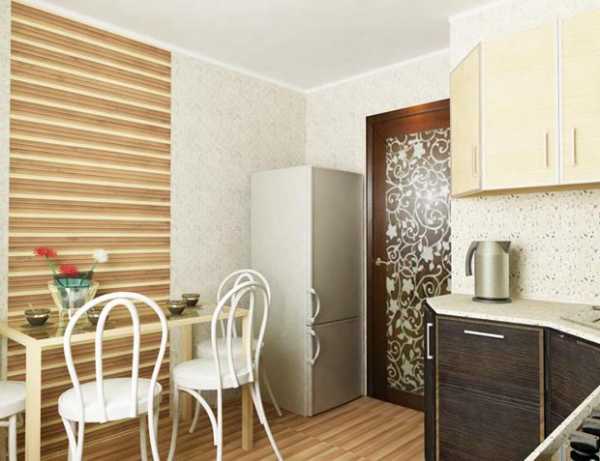 Совет: на одной из стен можно наклеить фотообои с пространственным рисунком – такая оптическая иллюзия визуально сделает кухню больше