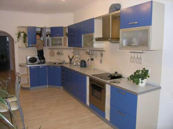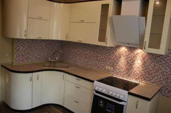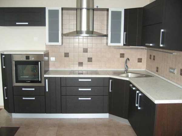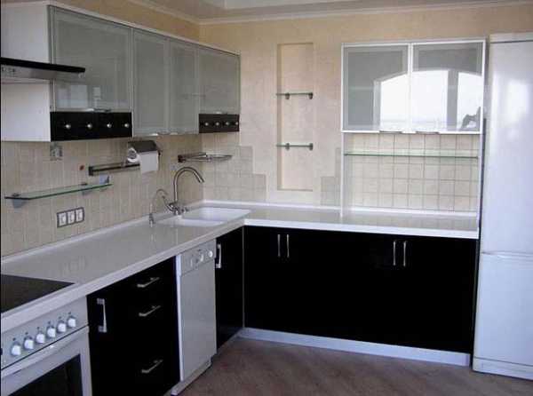 - г-образная – расположение мебели осуществляется по периметру соседних стен, при этом наиболее удобным вариантом считается встраиваемая техника;