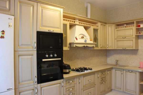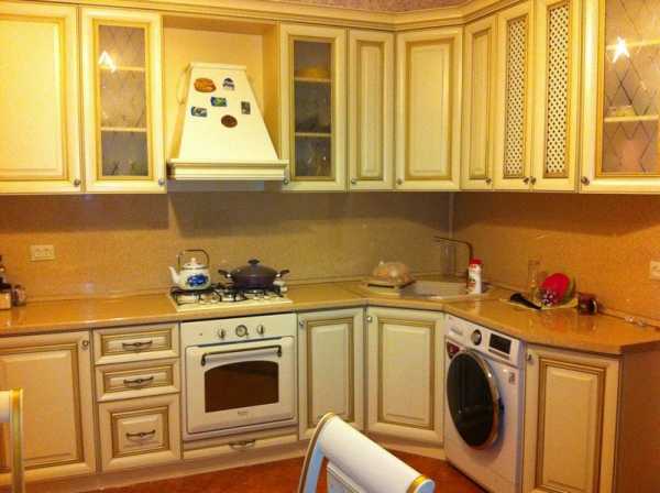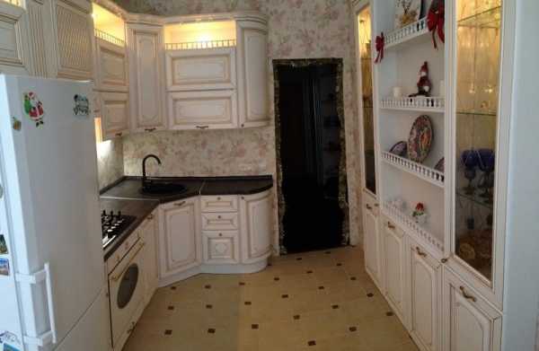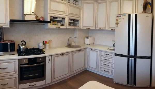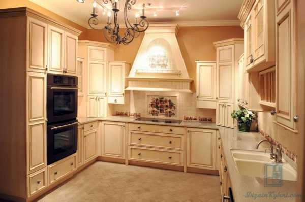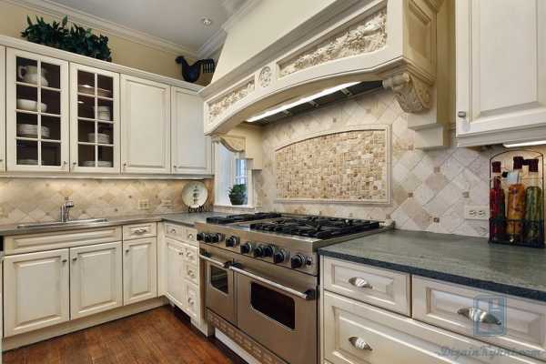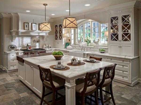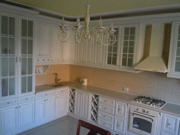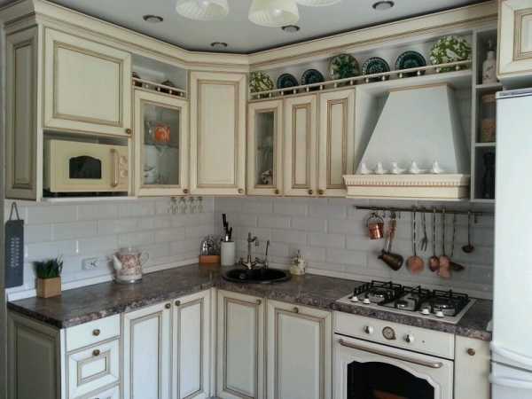 Интерьер белой кухни с золотистой патиной.Лучшие оттенки для создания гармоничного интерьера кухни: натуральный цвет древесины, бежевый, светло-серый, белый, пастельный, цвет кофе с молоком, цвет слоновой кости. Украшением кухни станет светлый текстиль — легкие шторы на окнах, кружевная скатерть, и тому подобное.