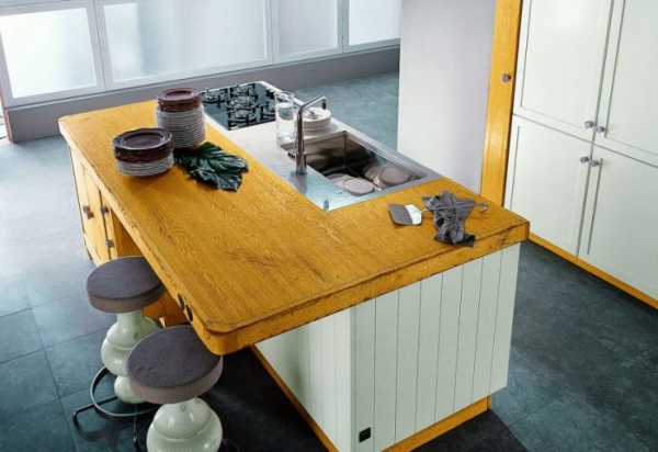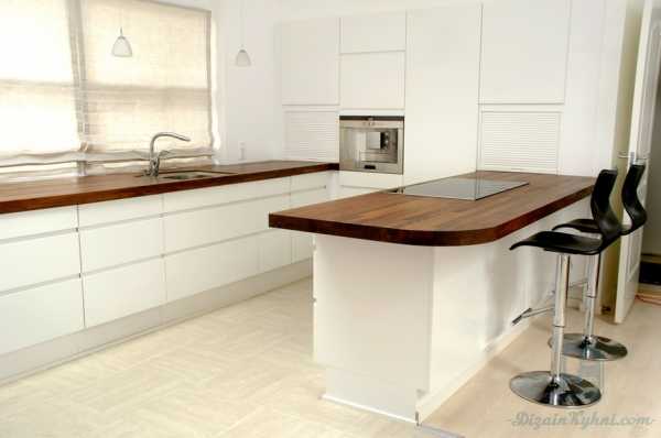 Островная белая кухня с деревянной столешницей больше всего подойдет для большой площади. При такой форме комбинируется линейный или угловой гарнитур с дополнительным большим столом посередине комнаты, который может быть на колесиках и выступать дополнительной рабочей поверхностью с раковиной или плитой.
