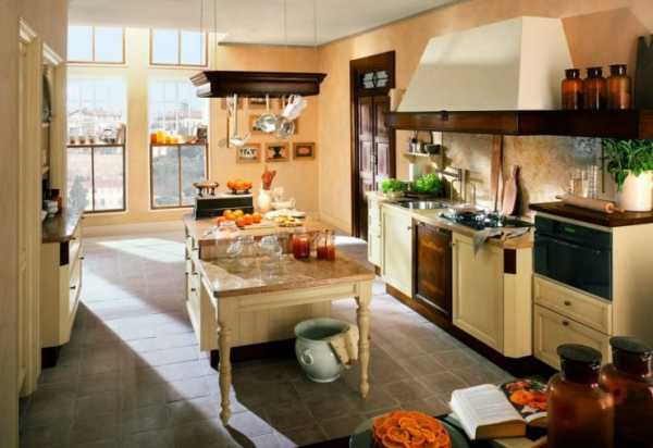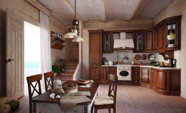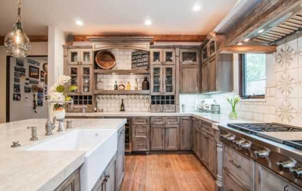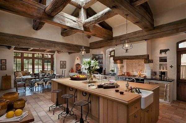 В деревенском стиле обычно используют натуральное дерево для отделки.Украшением такой кухни станет простая глиняная посуда на полках и короткие ситцевые занавески на окнах.