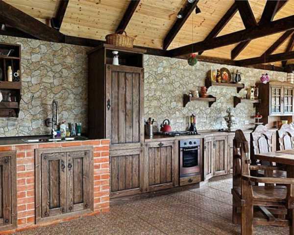Если Ваша кухня небольшая по площади, то уместно из дерева выбрать только гарнитур. А вот при наличии большого пространства, в дизайн хорошо впишется деревянная обшивка стен, арок, перегородок, порадует глаз и паркетный пол. Завершит элитный вариант кухни из натурального дерева в загородном доме полностью обшитый им потолок.