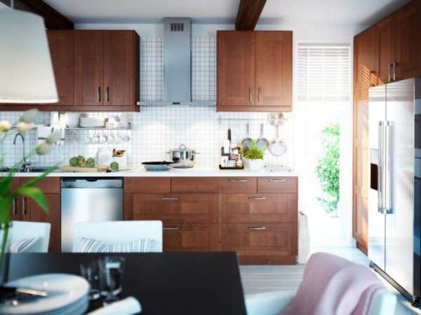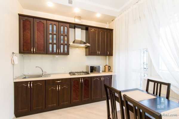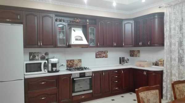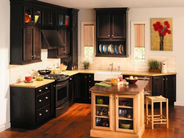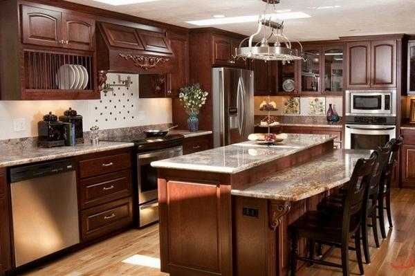 Стильная и практичная кухня из темного дерева.Гарнитур из темных оттенков древесины смотрится очень благородно и дорого. Он идеально подойдет для обустройства кухни в классическом стиле. Фасады такой мебели можно украсить резьбой и позолотой. Она будет прекрасно сочетаться с тяжелыми портьерами на окнах, массивной бронзовой люстрой, дорогим фарфором.